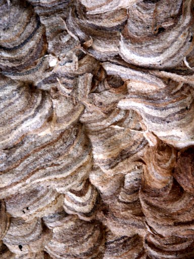 Occasionally fortune smiles to reveal such rarities as a nest of a colony of Bald Face Hornets (Dolichovespula maculata). These remarkable structures are built by workers who chew bits of wood, mix it with their saliva, and form it into the rugged egg-shaped nests we’ve all seen hanging from a branch or the eave of a house. By this time of year the nests have often begun to fall apart giving me a chance to look closely at the “paper” they are made of. It is both beautiful and astonishingly complex.