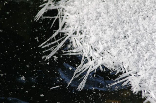 In this bitter cold weather delicate crystals form near the streamopen water in the stream.