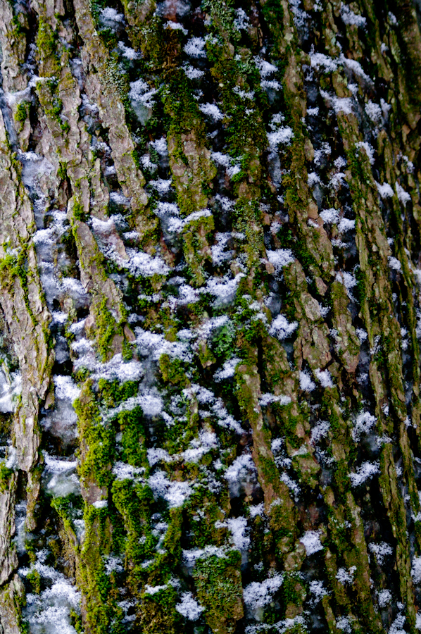 Snow on the bark of an older Sugar Maple forms a beautifully simple pattern.