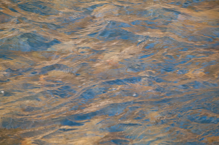 A rapids with blue sky and late afternoon clouds reflecting off the surface.