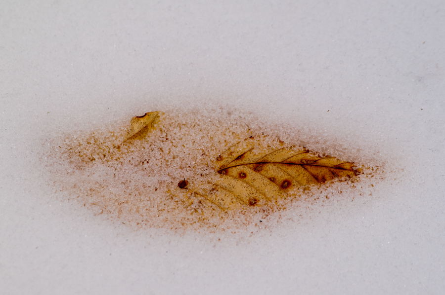 A leaf of American Beech (Fagus grandifolia) embedded in the snow. Beech often keeps its many of its leaves right up until new ones arrive in May.