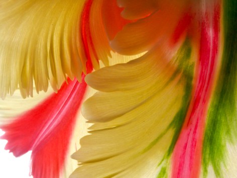 This photograph of a Parrot Tulip, made inside on my kitchen table on just such a sunny March day several years ago, is still one of my favorites. The heavy bloom had tipped downward, a magnificent complement to the curves of the petals and coloring, and I especially love the variable translucency in the sun’s backlighting.