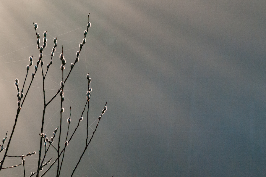 Sun streaming through the ice fog sets off the budding Pussy Willows quite nicely. As I was making this photograph I noticed there were many silk balloon threads of spiders between branches.