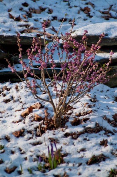 As lovely as the trip to Michigan was—I especially remember the Magnolias with pleasure—it is good to be back in Vermont. I woke to snow providing a backdrop to set off the early blooming Crocus, Forsythia and Daphne.