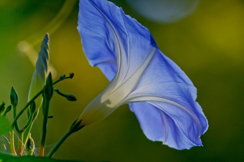 I especially love the way the sunlight comes through this “Heavenly Glory” Morning Glory (Ipomoea tricolor) flower resulting in the bud on the left being illuminated by the blue light.