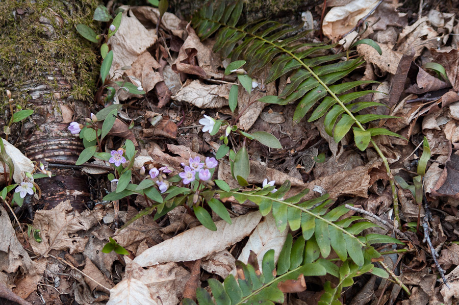 Spring Beauty (Claytonia virginica), one of the earliest of wild flowers, true to its name, graces the forest floor next to last years fronds of Christmas Fern (Polystichum acrostichoides).