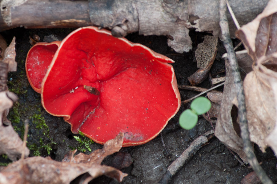 Scarlet Elf Cap (Sarcoscypha coccinea) was springing up from the forest floor in many places, such a surprising color to find any time of year but especially among the browns and grays of early spring.