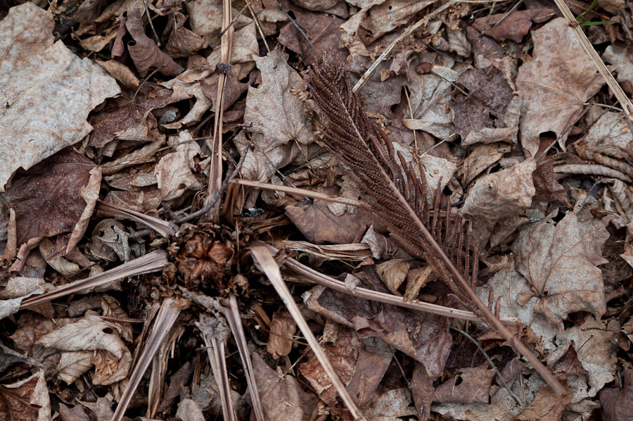 The remains of the leaf stems and fertile fronds of Ostrich Fern (Matteuccia struthiopteris) wait patiently, and brown, for warmer weather.