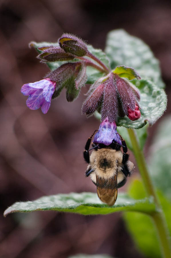 One of many reliable pollinators hard at work on Pulmonaria blossoms. The buzzing I hear comes from their wing muscles vibrating. Who knew?!