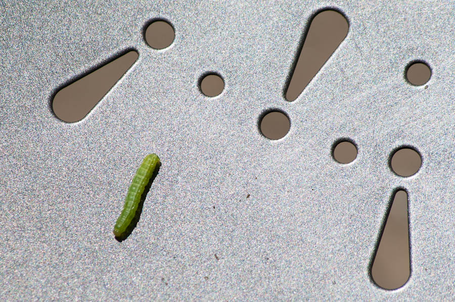 As I was about to sit down for lunch today, I noticed a small green larvae on the chair. I have no idea who this is!
