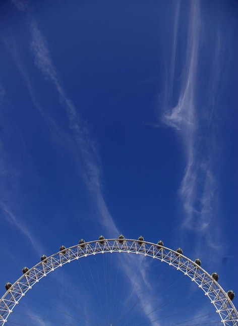 The hard curves and regular angles of the London Eye, a beautiful structure, look even more lovely against a blue sky with a few, wispy, amorphous clouds.