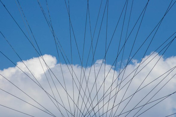 Another day looking up at the London Eye to see different clouds caught in the web of the structure. I love the contrasts: hard-edged cable and soft clouds. Black and white against the blue sky. The cloud’s amorphous form and the not quite symmetrical geometry of the cables. I enjoyed seeing the two interact.