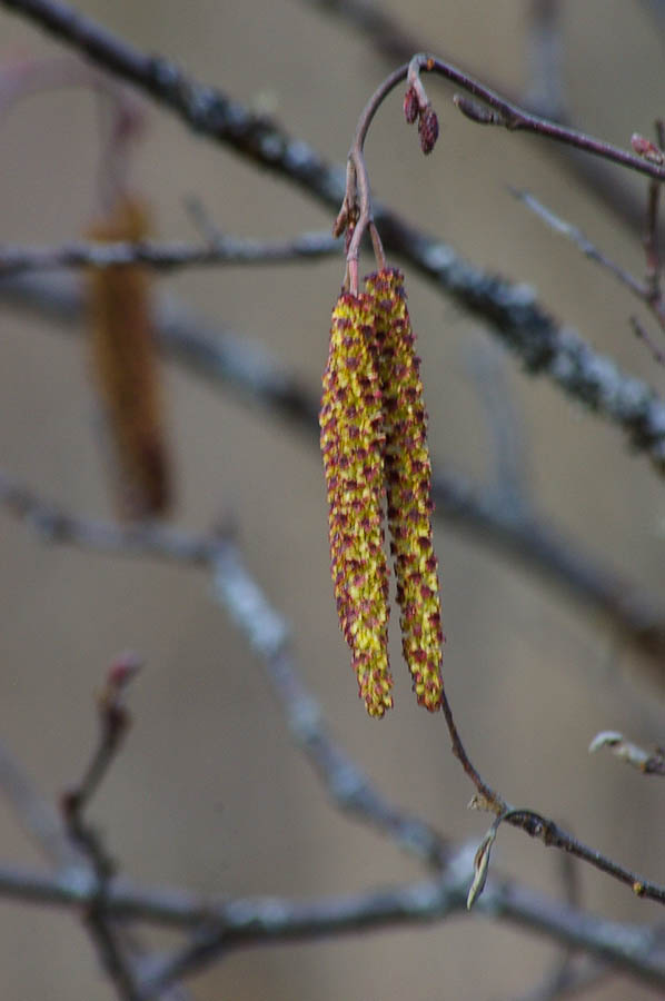 The soft, unfurled male flowers—catkins—of Beaked Hazel. These were releasing pollen a day or two later, even with snow still on the ground.