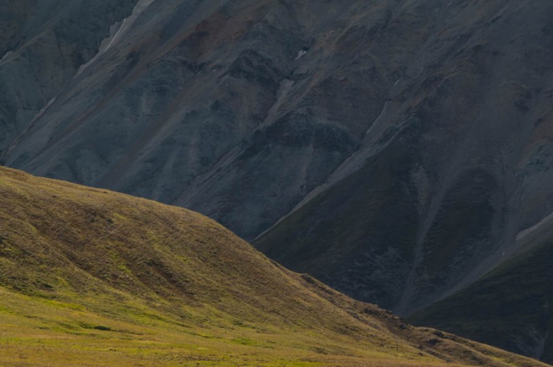 A tundra hillside contrasts beautifully against the backdrop of a “new” mountain in Denali National Park.