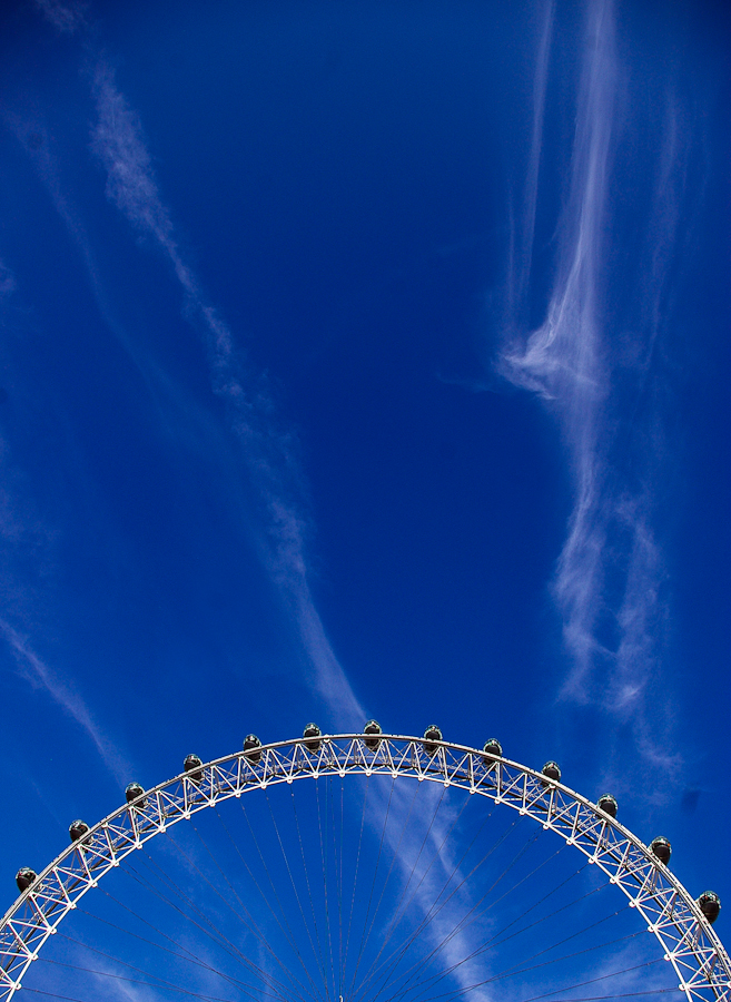 The London Eye, a huge Ferris wheel, was a wonderful contrast to the contrail clouds and stunning blue sky.