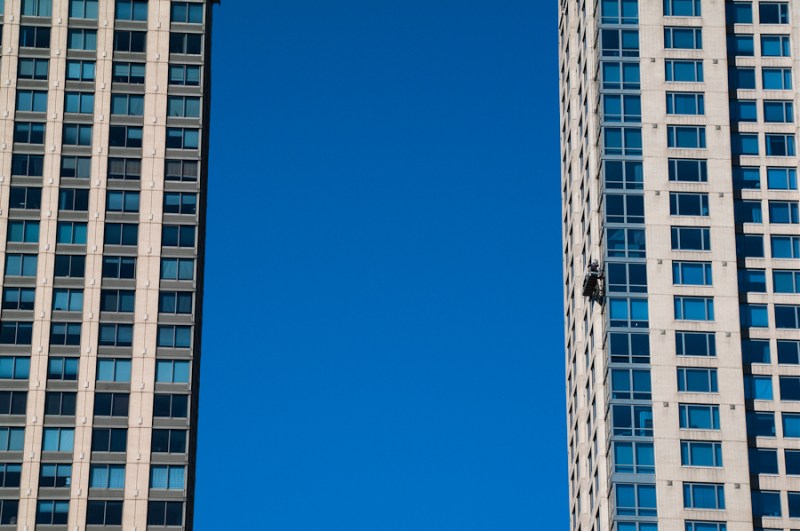 Two glass towers, the window washers and the great blue sky—what fun to take this slice of reality and just enjoy it!