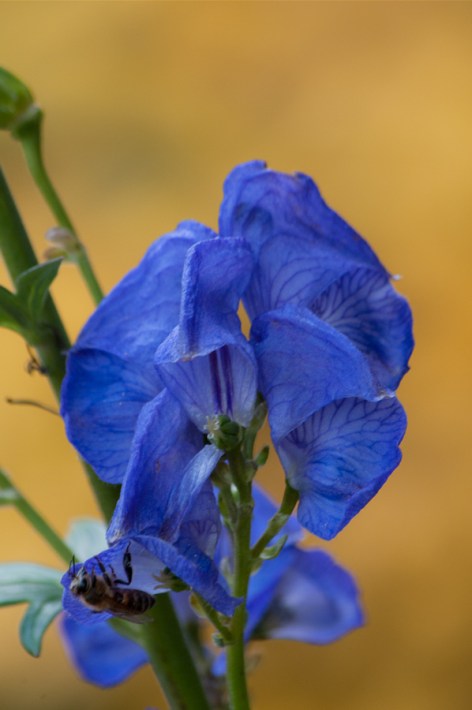 Late fall brings certain colors that I don’t see throughout the rest of the year. One of these is the odd shade of blue found in the flowers of Monkshood (Aconitum). Conveniently, the lovely golden-yellow leaves of a Witch Hazel (Hamamelis) bush were in the background. What a combination!