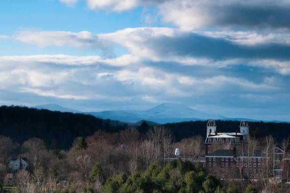 The view from Sabin’s Pasture back to the west shows a distant snow-covered Camel’s Hump with the lovely towers of College Hall, now part of Vermont College of Fine Arts (VCFA),  in the foreground.
