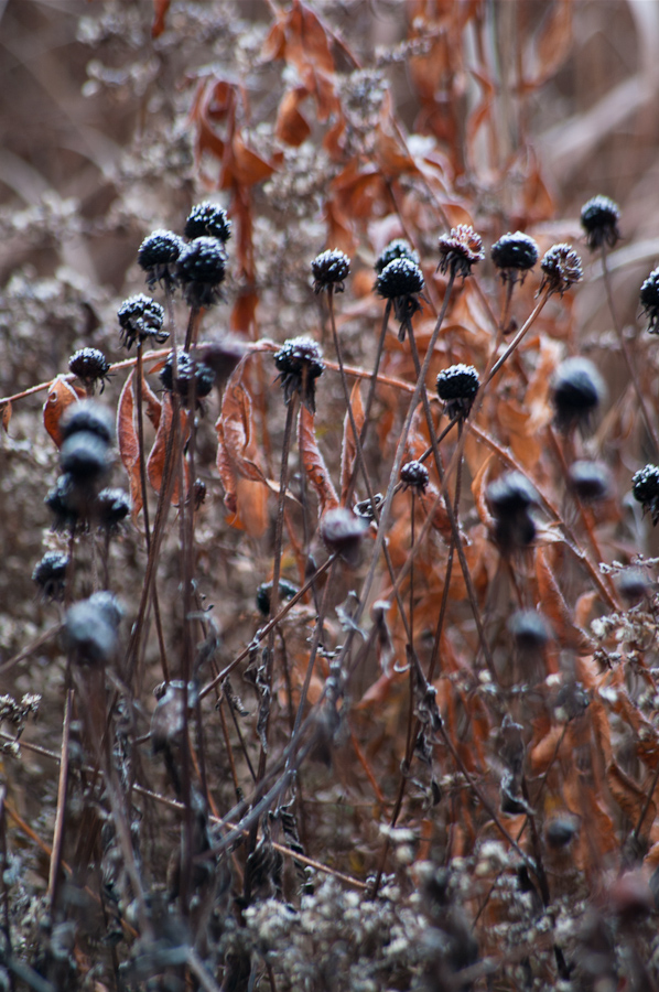 Frost covers the seed pods of Black-eyed Susan with the luchious red-browns of Gooseneck Loosestrife in the background.