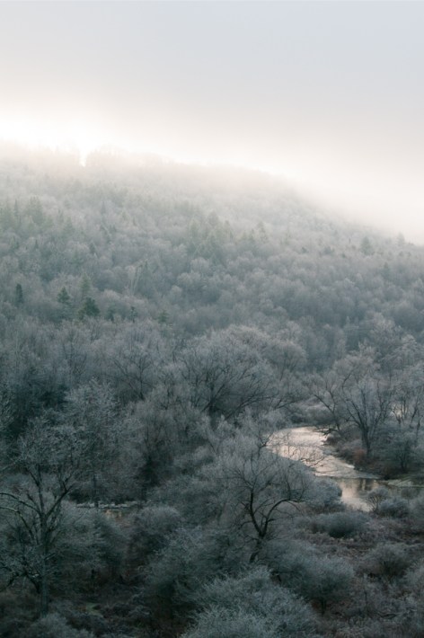 The hillside at North Branch Nature Center, covered in hoarfrost, sets off the shimmering bend of the river.