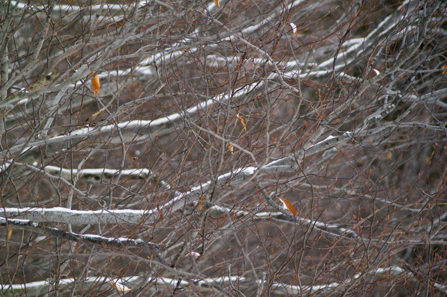 The often horizontal branches of Beech, with a few leaves hanging on all winter, are outlined by new snow.