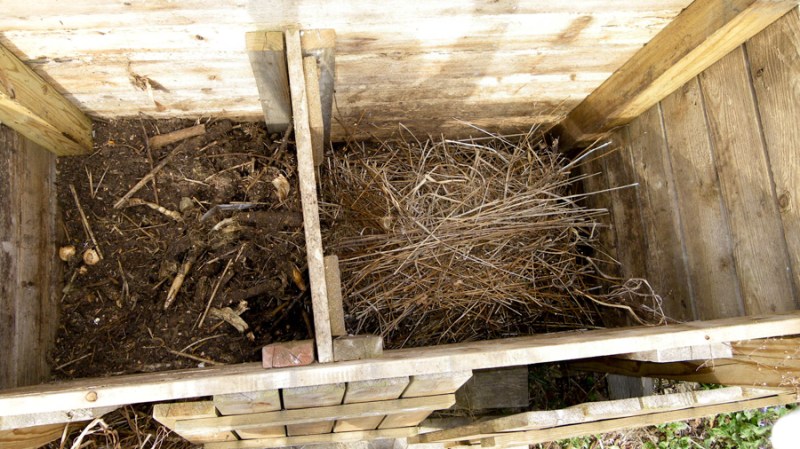 My two-part compost bin (new on right and finishing on left) allows for simple, effective management and turning.