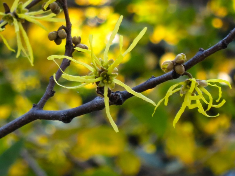 So many small views to delight, this of the newly opened flowers of Witch Hazel.