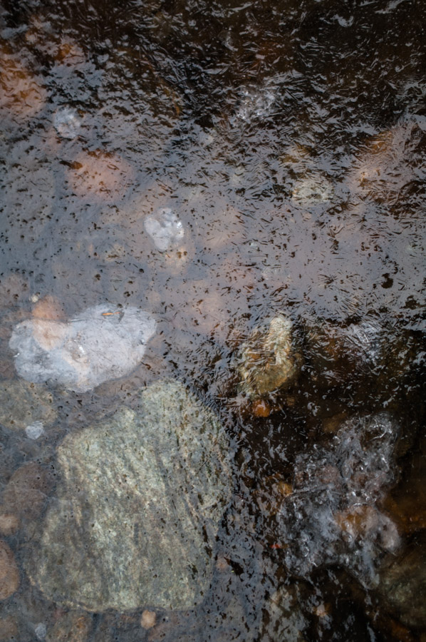 Another variable is how the light reflects off the ice itself. In this case it is a fairly strongly lit, overcast sky. As my angle of viewing changes it reveals the patterns of ice crystals not otherwise obvious.