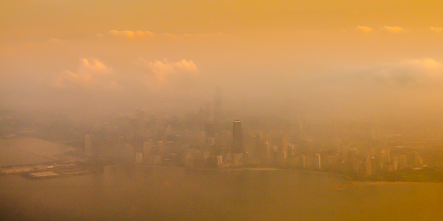 Turning back to the west to land at O’Hare brought the Chicago skyline into view just as the sun was setting through low clouds