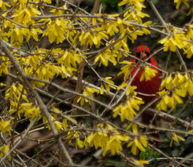 No answers here this morning. The Forsythia blooms are fallen, replaced by unfurling leaves. Maybe I can listen what the blue sky or the Cardinal have to say about this tangle of mine.