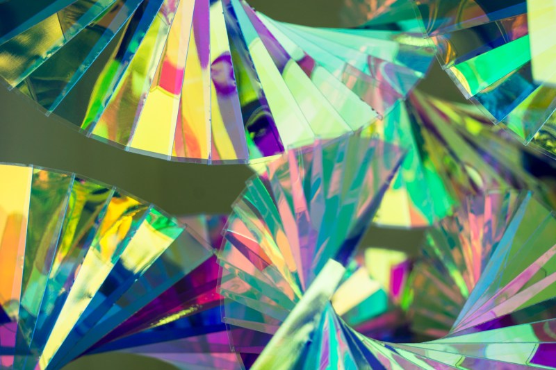 One of George Sherwood’s sculptures currently on display at Shelburne Museum splits white light into various colors and plays it back as a veritable light show. “Dichroic” films are shaped into a piece that would be interesting in and of itself but when you add the magic of light splitting, it shifts into a much more fascinating hyperdrive mode. In fact, all of these images are made of a single piece of work! Note: a similar light-splitting phenomenon and effect can be seen as light strikes the wings of some butterflies or feather of birds, especially those that appear iridescent blue in color.