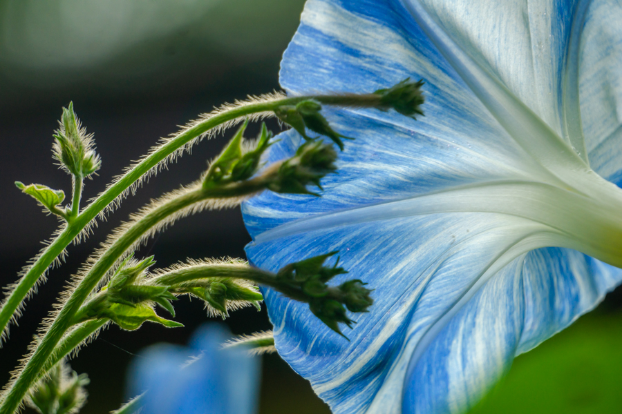 A delightful surprise to have these Heavenly Blue Morning Glories volunteer this year, mixed in on a post with purple Morning Glories, Clematis and grapes.