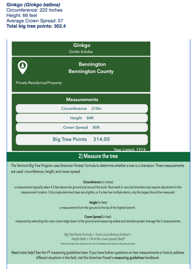Recently a friend from the Vermont Extension Service met a group from the Montpelier Tree Board to make an official measurement of this old tree, both just to do so, and to see how it measures up against the Vermont’s biggest Ginkgo which grows in Bennington. The good news is we have a very large and healthy tree in our city. The other news? It is not quite the champion—the data for “our” tree is at the top and for the Champion, below: