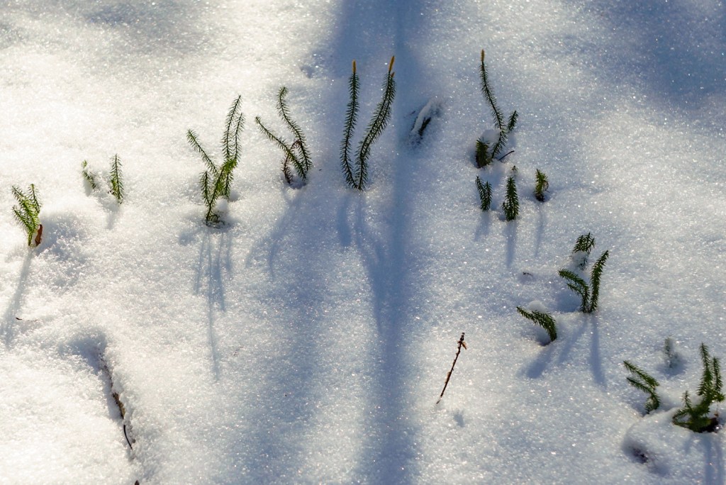 Club moss, a plant that has grown on Earth since pre-historic times, soaking up the life-giving sun on a cold, snowy morning.