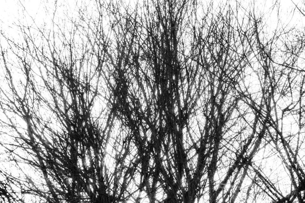 The view out my window of the bright, morning sun shining through the branches of a group of Maple trees.