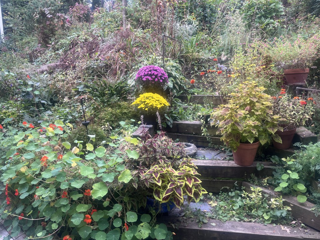 It can take only moments these days to find the peace of a good night’s sleep vaporized as the morning headlines scream at me from my screen. I’m not one who is willing to completely turn this confounded machine off, however, a news diet is warranted this morning! And then taking time for a look out the window—a walk too when it warms a bit more—at the gorgeous other “headlines” in the yard announcing the official arrival of Fall.